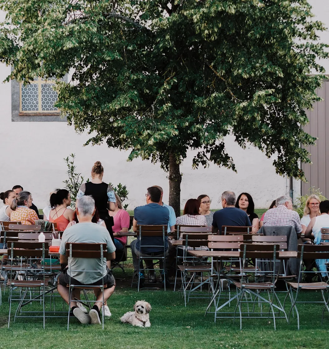 Unter den alten, schattenspendenden Kastanien entsteht eine entspannte, gemütliche Atmosphäre – ideal, um gemeinsam zu genießen, zu feiern und besondere Augenblicke im Freien zu erleben.