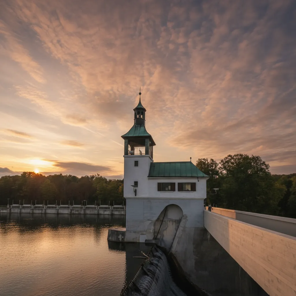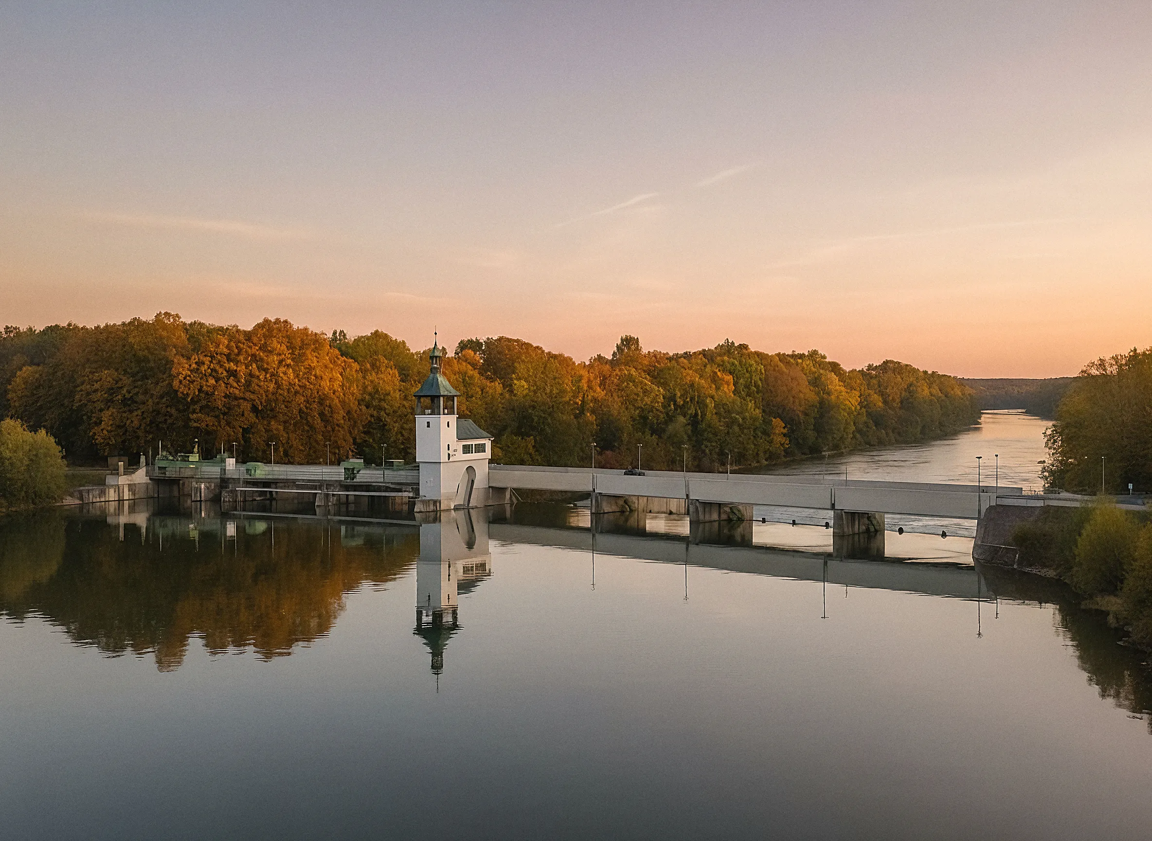 Gleichmäßiges Rauschen am Hochablass: Flusslandschaft und Technik treffen seit Jahrhunderten aufeinander. Klarliniges Bauwerk, goldene Abendstimmung, feiner Sprühnebel.